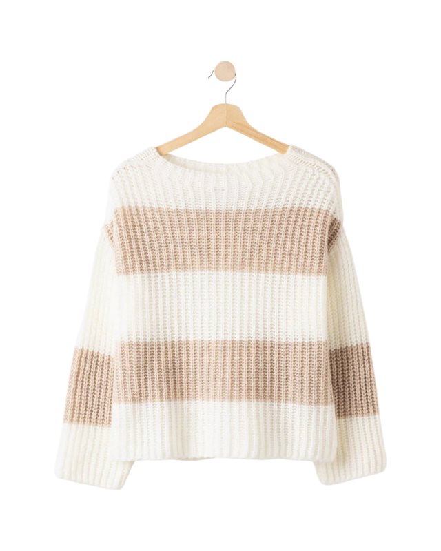 Stickad tröja i en högkvalitativ mjuk merinoullsblandning. Avslappnad passform och nedhasad axel. Rak halsringning och enkla avslut utan muddar. Hållbart producerad i Europa.