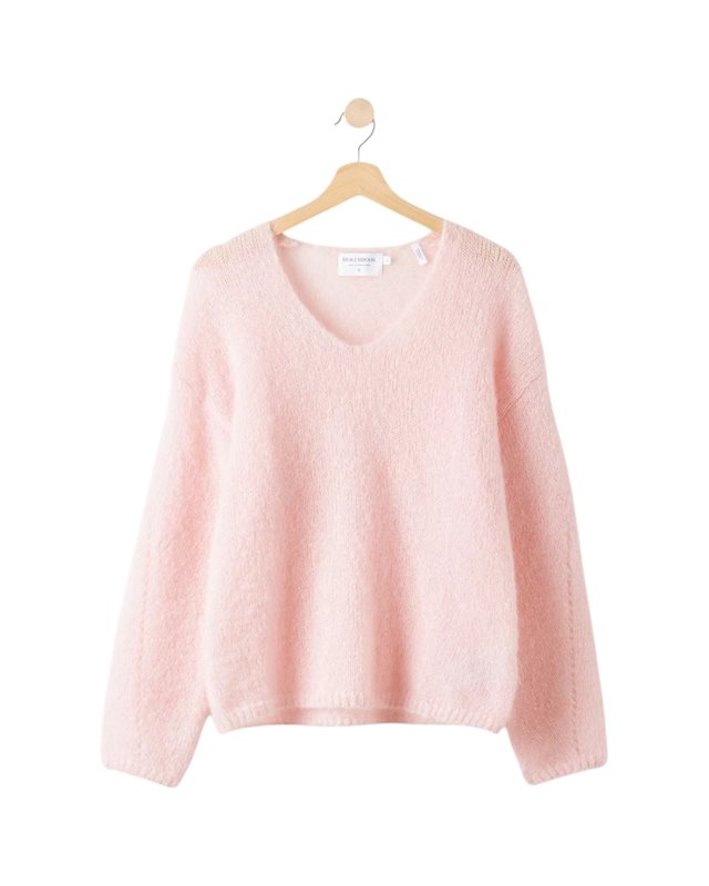 Luftig slätstickad v-ringad tröja i kidmohair och polyamid. Avslappnad passform med vid ärm och hålmönstrade detaljer. Ribbade avslut och nedhasad axel. Hållbart producerad i Europa.