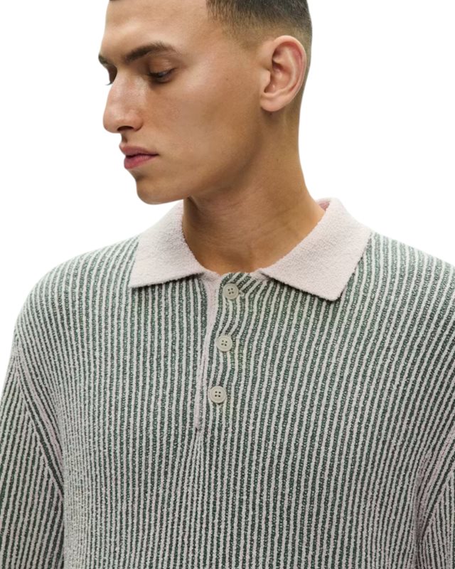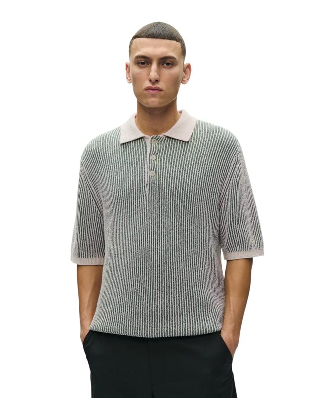 Den stickade pikétröjan har tydlig struktur och kontrasterande krage. Avslappnad passform, kort ärm och treknappsknäppning definierar looken.