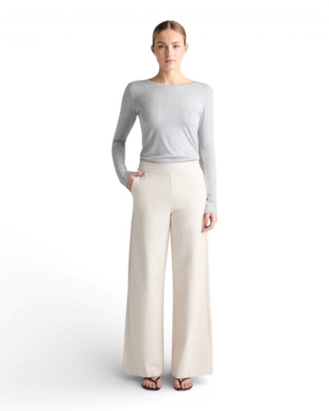 Leia är en högmidjad byxa med vida ben i full längd och sidfickor. Byxan har en elastisk midjeresår och är tillverkad i kraftig stretchjersey.