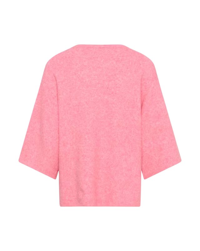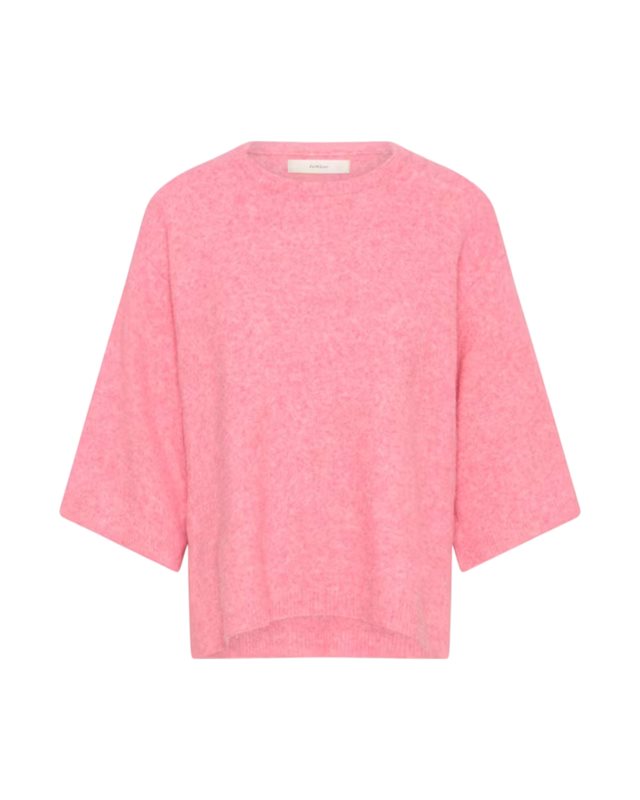 Boxig stickad topp med bred rund hals och armbågslånga ärmar. Rak siluett och mjukt uttryck för en modern, avskalad look.
