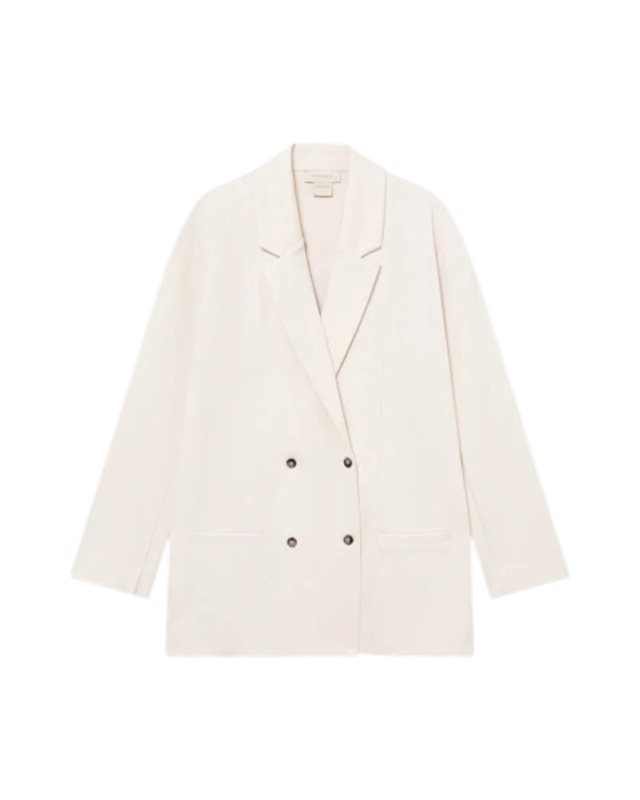 Arda är en dubbelknäppt kavaj med en kraftig, strukturerad känsla. Den har en rak, något längre silhuett, en kraftig strukturerad krage och två framfickor med kantband för en skräddarsydd och sofistikerad look.