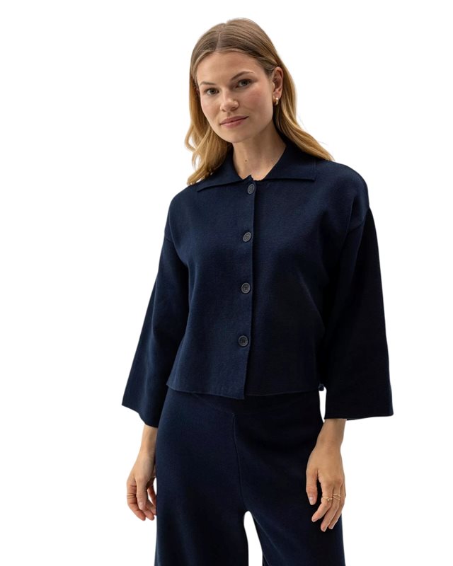 Milanostickad jacka i 100% ekologisk bomull. Krage med råa avslut och knappar framtill. Kort modell med trekvartsärm, nedhasad axel och tidlös design. Hållbart producerad i Europa.