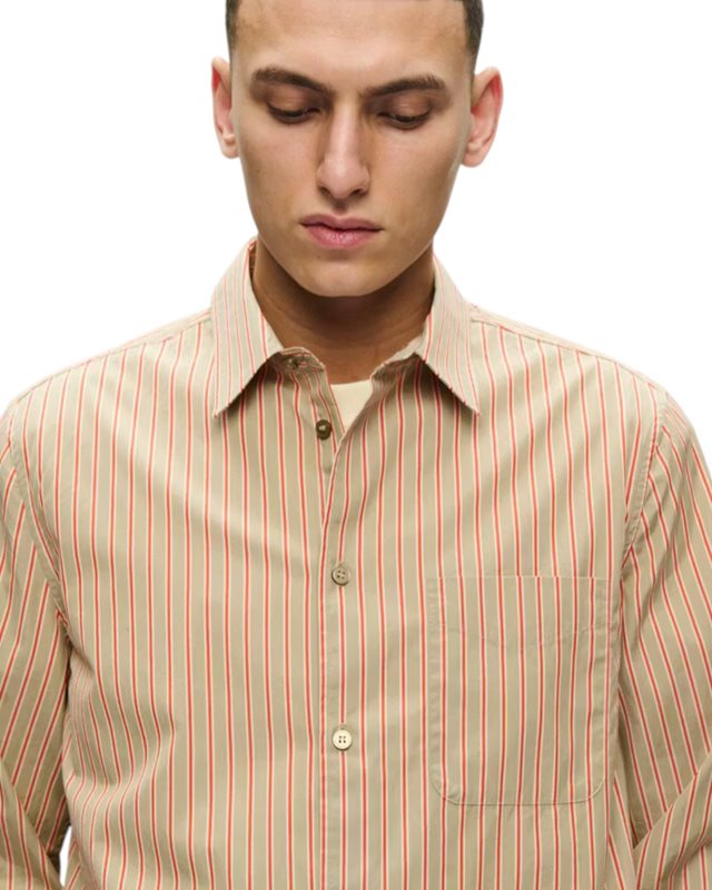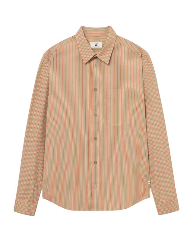 Randig skjorta med rak passform och mjuk yta. Klassisk krage, hel knäppning framtill, bröstficka samt långa ärmar med manschettknapp.
