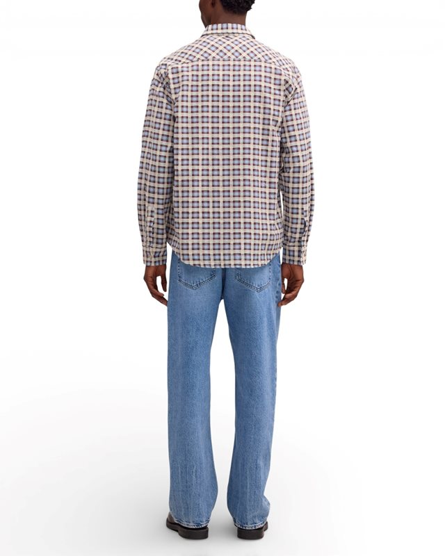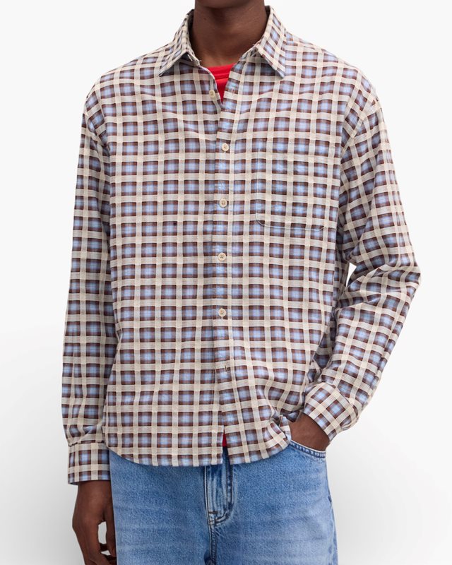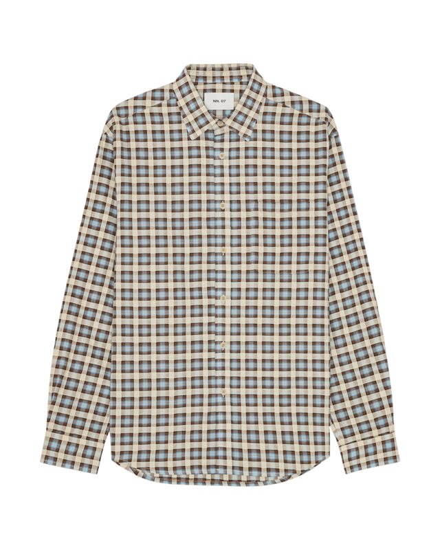 Rutig skjorta i i regular fit gjord av ekologisk bomull med lätt leno‑vävd struktur och mjuk handkänsla, vilket ger ett luftigt, nätliknande uttryck. Avslutad med påsydd bröstficka och NN.07‑knappar i corozo.