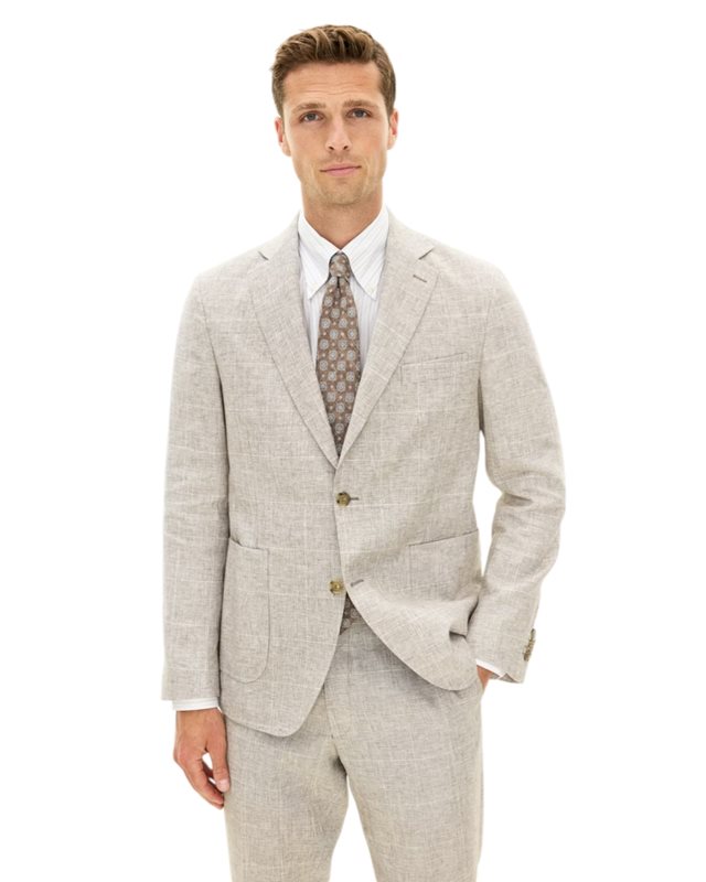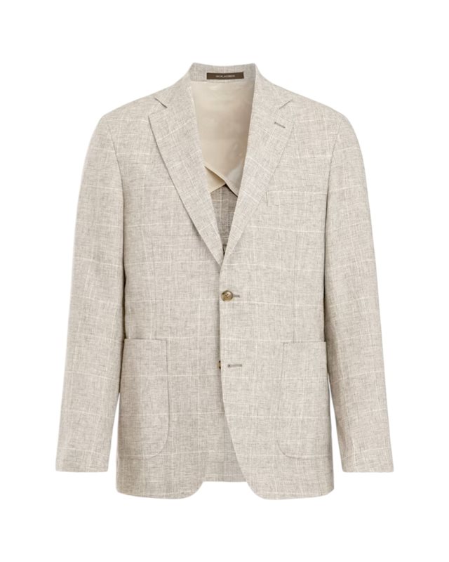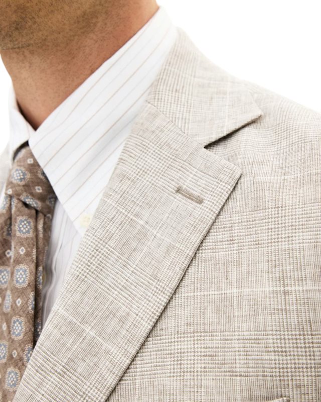 En enkelknäppt kavaj i en linneblandning med glencheck-mönster och en lätt okonstruerad känsla. Den vävda strukturen ger ett luftigt fall och en sofistikerad yta. Regular fit-silhuetten skapar en balanserad look som fungerar lika bra till skräddade byxor som till mer avslappnade kombinationer.
