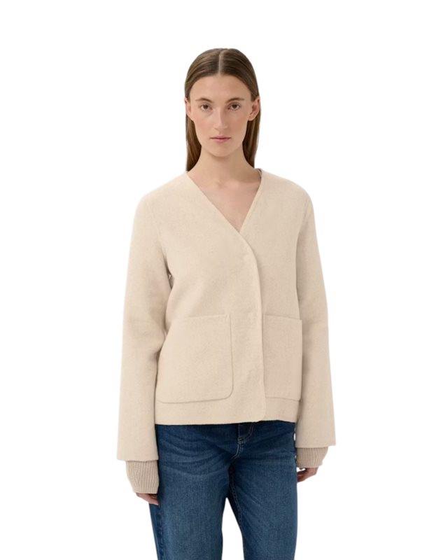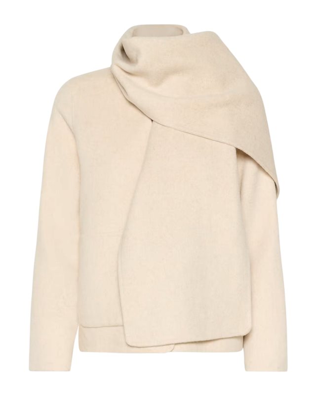 Jacka med skulptural omlottkrage och långa ärmar. Rak siluett och slät yta ger en modern, självsäker stil.