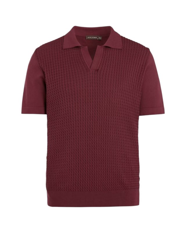 Kortärmad stickad kragtröja i plaggfärgad bomull. Stickad i 12gg med fin kabelstruktur på framstycket. Utan knappar fram som ger ett mer ledigt uttryck. Fint plagg att använda till uddabyxor men kan lika gärna bäras under en ledig kostym eller kavaj.